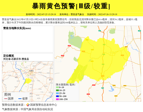 赞皇县气象台2022年07月25日15时24分发布暴雨黄色预警信号:目前我县北清河降水量已达68.4毫米,清河56.2毫米,县城55.1毫米,预计今天下午到夜间降水仍将继续,累计降水量将达到100毫米以上,请有关单位和人员做好防范准备。 信息来源:国家预警信息发布中心; 发布单位:赞皇县气象台。