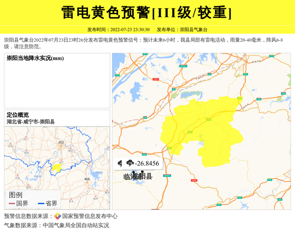 崇阳县气象台2022年07月23日23时26分发布雷电黄色预警信号:预计未来6小时,我县局部有雷电活动,雨量20-40毫米,阵风6-8级,请注意防范。 信息来源:国家预警信息发布中心; 发布单位:崇阳县气象台。