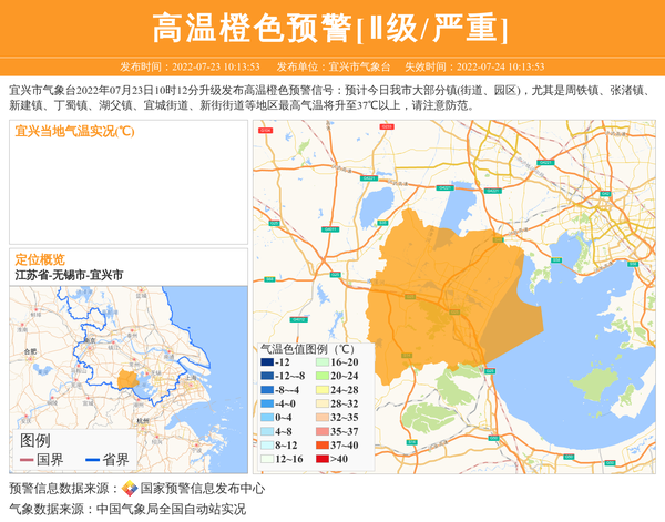 宜兴市气象台2022年07月23日10时12分升级发布高温橙色预警信号:预计今日我市大部分镇(街道、园区),尤其是周铁镇、张渚镇、新建镇、丁蜀镇、湖父镇、宜城街道、新街街道等地区最高气温将升至37℃以上,请注意防范。 信息来源:国家预警信息发布中心; 发布单位:宜兴市气象台。