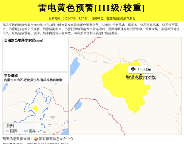 鄂温克族自治旗气象台2022年07月24日13时21分发布雷电黄色预警信号:6小时内伊敏苏木、辉苏木、锡尼河东苏木、锡尼河西苏木、巴彦塔拉达斡尔民族乡、巴彦嵯岗苏木、巴彦托海镇可能发生雷电活动,局部地区伴有短时强降水、雷暴大风、冰雹等强对流天气,可能造成雷电、洪涝、城市内涝等灾害事故。请有关单位和人员做好防范准备。 信息来源:国家预警信息发布中心; 发布单位:鄂温克族自治旗气象台。