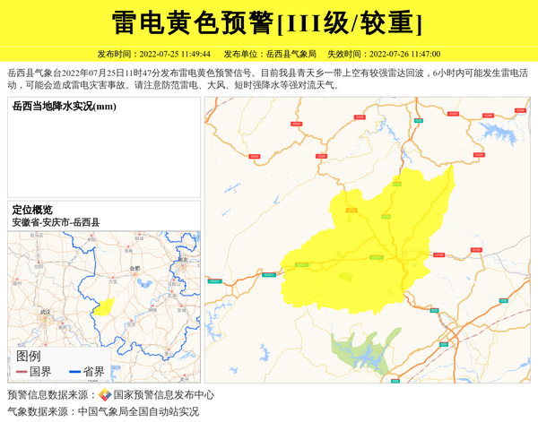 岳西县气象台2022年07月25日11时47分发布雷电黄色预警信号。目前我县青天乡一带上空有较强雷达回波,6小时内可能发生雷电活动,可能会造成雷电灾害事故。请注意防范雷电、大风、短时强降水等强对流天气。 信息来源:国家预警信息发布中心; 发布单位:岳西县气象局。