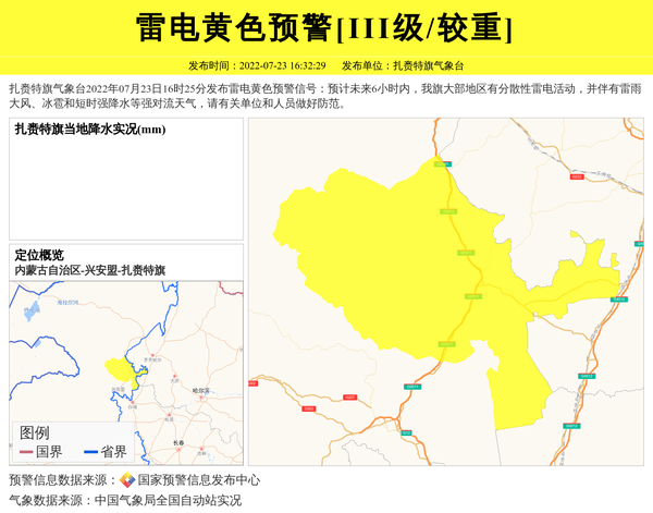 扎赉特旗气象台2022年07月23日16时25分发布雷电黄色预警信号:预计未来6小时内,我旗大部地区有分散性雷电活动,并伴有雷雨大风、冰雹和短时强降水等强对流天气,请有关单位和人员做好防范。 信息来源:国家预警信息发布中心; 发布单位:扎赉特旗气象台。
