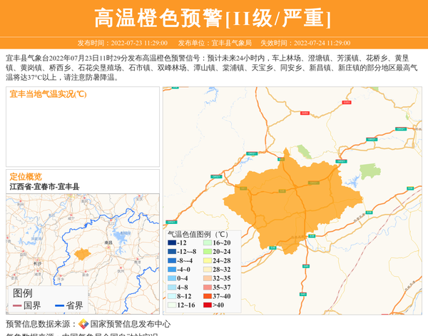 宜丰县气象台2022年07月23日11时29分发布高温橙色预警信号:预计未来24小时内,车上林场、澄塘镇、芳溪镇、花桥乡、黄垦镇、黄岗镇、桥西乡、石花尖垦殖场、石市镇、双峰林场、潭山镇、棠浦镇、天宝乡、同安乡、新昌镇、新庄镇的部分地区最高气温将达37°C以上,请注意防暑降温。 信息来源:国家预警信息发布中心; 发布单位:宜丰县气象局。