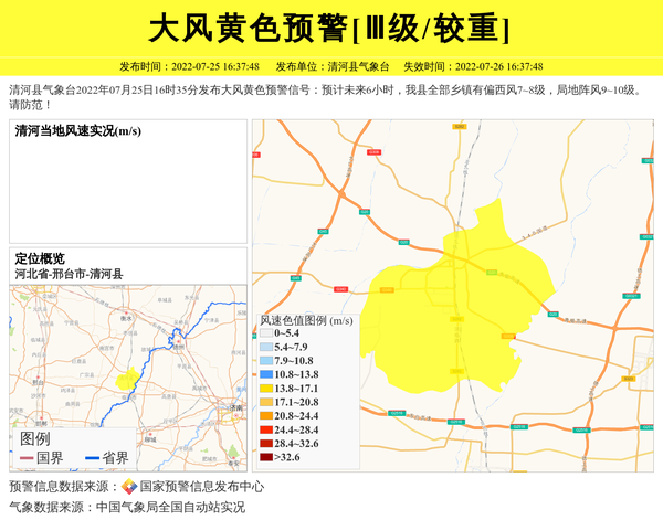 清河县气象台2022年07月25日16时35分发布大风黄色预警信号:预计未来6小时,我县全部乡镇有偏西风7~8级,局地阵风9~10级。请防范! 信息来源:国家预警信息发布中心; 发布单位:清河县气象台。