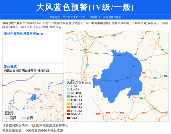 准格尔旗气象台2022年07月24日15时20分发布大风蓝色预警信号:24小时内准格尔旗可能受大风影响,平均风力可达6级以上,或者阵风7级以上。请有关单位和人员做好防范准备。 信息来源:国家预警信息发布中心; 发布单位:准格尔旗气象台。