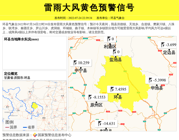 环县气象台2022年07月24日22时39分发布雷雨大风黄色预警信号:预计今天夜间,我县洪德镇、天池乡、合道镇、樊家川镇、八珠乡、耿湾乡、秦团庄乡、罗山川乡、虎洞镇、环城镇、曲子镇、木钵镇等乡镇部分地方可能受雷雨大风影响,平均风力可达6级以上,或阵风8级以上并伴有强雷电,将对交通或农牧业等有影响,请注意防范。 信息来源:国家预警信息发布中心; 发布单位:环县气象台。