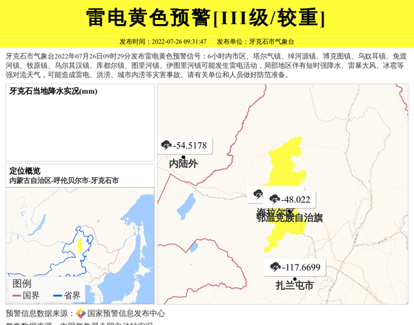 牙克石市气象台2022年07月26日09时29分发布雷电黄色预警信号:6小时内市区、塔尔气镇、绰河源镇、博克图镇、乌奴耳镇、免渡河镇、牧原镇、乌尔其汉镇、库都尔镇、图里河镇、伊图里河镇可能发生雷电活动,局部地区伴有短时强降水、雷暴大风、冰雹等强对流天气,可能造成雷电、洪涝、城市内涝等灾害事故。请有关单位和人员做好防范准备。 信息来源:国家预警信息发布中心; 发布单位:牙克石市气象台。