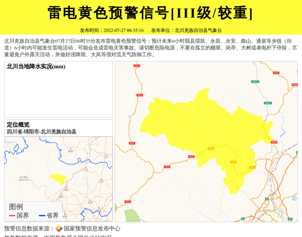 北川羌族自治县气象台07月27日06时35分发布雷电黄色预警信号:预计未来6小时我县擂鼓、永昌、永安、曲山、通泉等乡镇(街道)6小时内可能发生雷电活动,可能会造成雷电灾害事故。请切断危险电源,不要在孤立的棚屋、岗亭、大树或者电杆下停留,尽量避免户外露天活动,并做好强降雨、大风等强对流天气防御工作。 信息来源:国家预警信息发布中心; 发布单位:北川羌族自治县气象台。