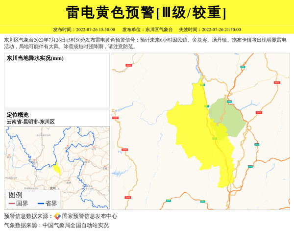 东川区气象台2022年7月26日15时50分发布雷电黄色预警信号:预计未来6小时因民镇、舍块乡、汤丹镇、拖布卡镇将出现明显雷电活动,局地可能伴有大风、冰雹或短时强降雨,请注意防范。 信息来源:国家预警信息发布中心; 发布单位:东川区气象台。