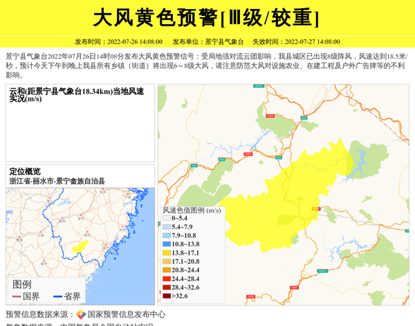 景宁县气象台2022年07月26日14时08分发布大风黄色预警信号:受局地强对流云团影响,我县城区已出现8级阵风,风速达到18.5米/秒,预计今天下午到晚上我县所有乡镇(街道)将出现6~8级大风,请注意防范大风对设施农业、在建工程及户外广告牌等的不利影响。 信息来源:国家预警信息发布中心; 发布单位:景宁县气象台。