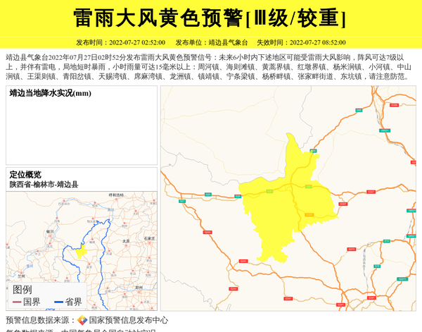 靖边县气象台2022年07月27日02时52分发布雷雨大风黄色预警信号:未来6小时内下述地区可能受雷雨大风影响,阵风可达7级以上,并伴有雷电,局地短时暴雨,小时雨量可达15毫米以上:周河镇、海则滩镇、黄蒿界镇、红墩界镇、杨米涧镇、小河镇、中山涧镇、王渠则镇、青阳岔镇、天赐湾镇、席麻湾镇、龙洲镇、镇靖镇、宁条梁镇、杨桥畔镇、张家畔街道、东坑镇,请注意防范。 信息来源:国家预警信息发布中心; 发布单位:靖边县气象台。