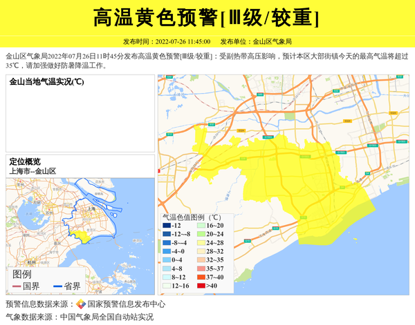 金山区气象局2022年07月26日11时45分发布高温黄色预警[Ⅲ级/较重]:受副热带高压影响,预计本区大部街镇今天的最高气温将超过35℃,请加强做好防暑降温工作。 信息来源:国家预警信息发布中心; 发布单位:金山区气象局。