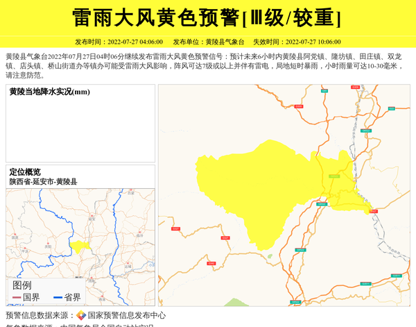黄陵县气象台2022年07月27日04时06分继续发布雷雨大风黄色预警信号:预计未来6小时内黄陵县阿党镇、隆坊镇、田庄镇、双龙镇、店头镇、桥山街道办等镇办可能受雷雨大风影响,阵风可达7级或以上并伴有雷电,局地短时暴雨,小时雨量可达10-30毫米,请注意防范。 信息来源:国家预警信息发布中心; 发布单位:黄陵县气象台。