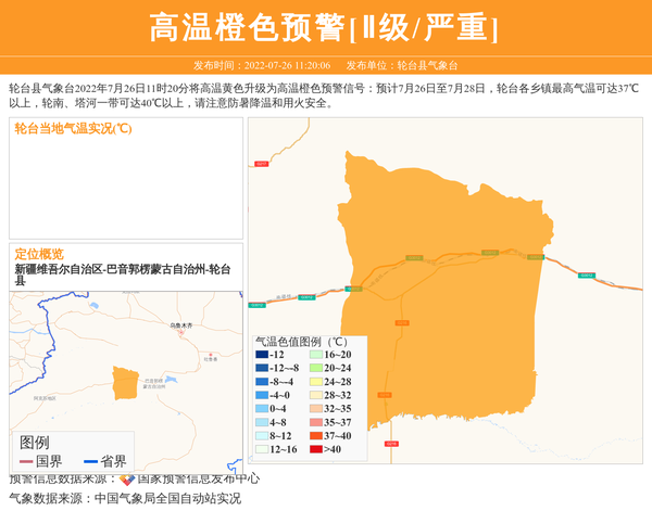 轮台县气象台2022年7月26日11时20分将高温黄色升级为高温橙色预警信号:预计7月26日至7月28日,轮台各乡镇最高气温可达37℃以上,轮南、塔河一带可达40℃以上,请注意防暑降温和用火安全。 信息来源:国家预警信息发布中心; 发布单位:轮台县气象台。