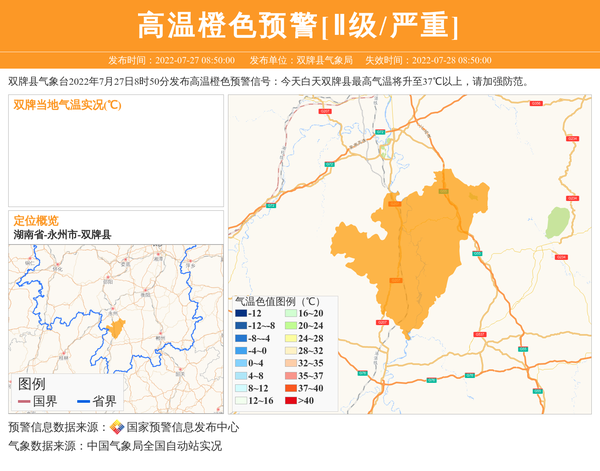双牌县气象台2022年7月27日8时50分发布高温橙色预警信号:今天白天双牌县最高气温将升至37℃以上,请加强防范。 信息来源:国家预警信息发布中心; 发布单位:双牌县气象局。