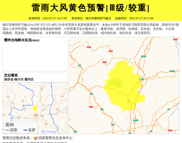 铜川市耀州区气象台2022年7月27日14时27分发布雷雨大风黄色预警信号:未来6小时内下述地区可能受雷雨大风影响,阵风可达7级或以上并伴有雷电,局地有冰雹或短时暴雨,小时雨量可达20毫米以上:董家河镇、庙湾镇、孙塬镇、石柱镇、关庄镇、小丘镇、瑶曲镇、照金镇、锦阳路街道、永安路街道、天宝路街道、正阳路街道、咸丰路街道、坡头街道,请注意防范。 信息来源:国家预警信息发布中心; 发布单位:铜川市耀州区气象台。