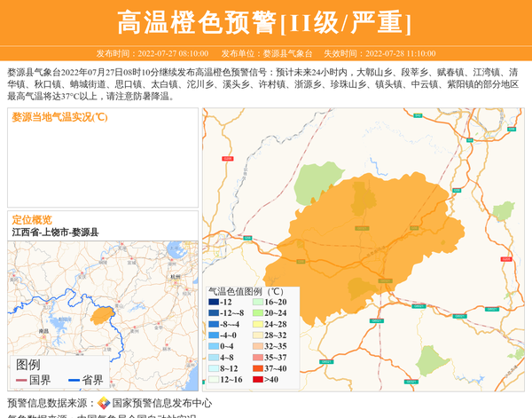 婺源县气象台2022年07月27日08时10分继续发布高温橙色预警信号:预计未来24小时内,大鄣山乡、段莘乡、赋春镇、江湾镇、清华镇、秋口镇、蚺城街道、思口镇、太白镇、沱川乡、溪头乡、许村镇、浙源乡、珍珠山乡、镇头镇、中云镇、紫阳镇的部分地区最高气温将达37°C以上,请注意防暑降温。 信息来源:国家预警信息发布中心; 发布单位:婺源县气象台。