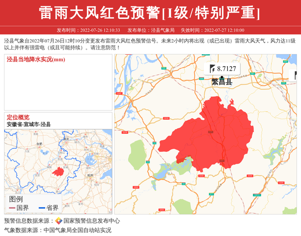泾县气象台2022年07月26日12时10分变更发布雷雨大风红色预警信号。未来2小时内将出现(或已出现)雷雨大风天气,风力达11级以上并伴有强雷电(或且可能持续)。请注意防范! 信息来源:国家预警信息发布中心; 发布单位:泾县气象局。