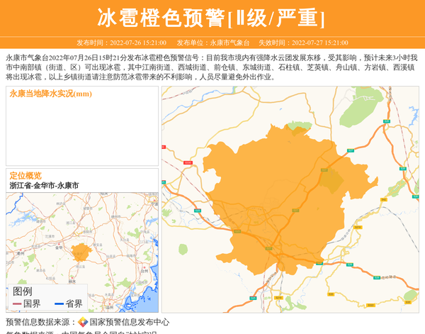 永康市气象台2022年07月26日15时21分发布冰雹橙色预警信号:目前我市境内有强降水云团发展东移,受其影响,预计未来3小时我市中南部镇(街道、区)可出现冰雹,其中江南街道、西城街道、前仓镇、东城街道、石柱镇、芝英镇、舟山镇、方岩镇、西溪镇将出现冰雹,以上乡镇街道请注意防范冰雹带来的不利影响,人员尽量避免外出作业。 信息来源:国家预警信息发布中心; 发布单位:永康市气象台。