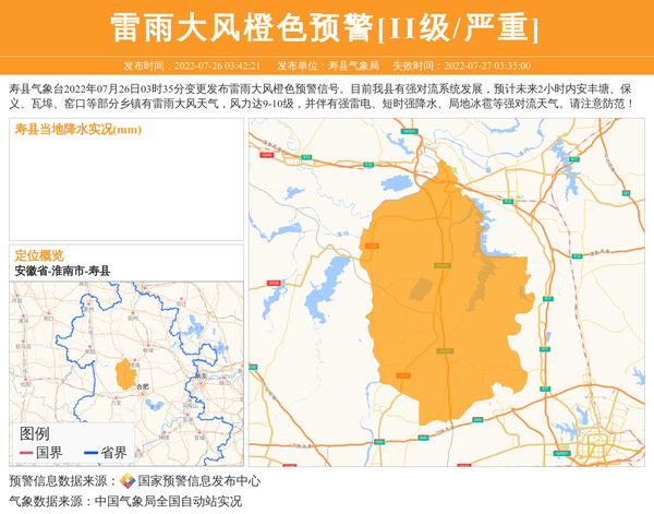 寿县气象台2022年07月26日03时35分变更发布雷雨大风橙色预警信号。目前我县有强对流系统发展,预计未来2小时内安丰塘、保义、瓦埠、窑口等部分乡镇有雷雨大风天气,风力达9-10级,并伴有强雷电、短时强降水、局地冰雹等强对流天气。请注意防范! 信息来源:国家预警信息发布中心; 发布单位:寿县气象局。