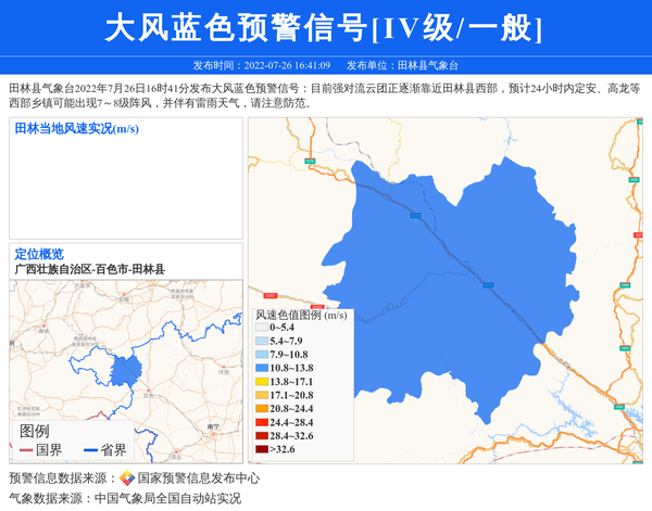 田林县气象台2022年7月26日16时41分发布大风蓝色预警信号:目前强对流云团正逐渐靠近田林县西部,预计24小时内定安、高龙等西部乡镇可能出现7~8级阵风,并伴有雷雨天气,请注意防范。 信息来源:国家预警信息发布中心; 发布单位:田林县气象台。