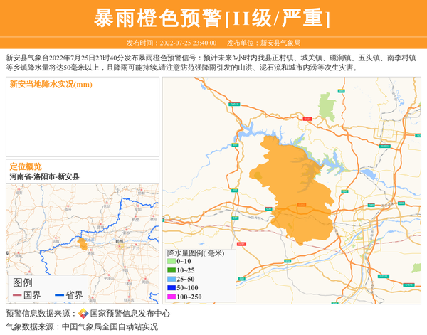 新安县气象台2022年7月25日23时40分发布暴雨橙色预警信号:预计未来3小时内我县正村镇、城关镇、磁涧镇、五头镇、南李村镇等乡镇降水量将达50毫米以上,且降雨可能持续,请注意防范强降雨引发的山洪、泥石流和城市内涝等次生灾害。 信息来源:国家预警信息发布中心; 发布单位:新安县气象局。