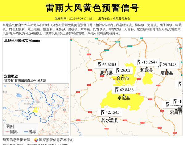 卓尼县气象台2022年07月26日17时11分发布雷雨大风黄色预警信号:预计6小时内,我县纳浪镇、柳林镇、完冒镇、阿子滩镇、申藏镇、杓哇土族乡、藏巴哇镇、恰盖乡、康多乡、洮砚镇、木耳镇、扎古录镇、喀尔钦镇、刀告乡、尼巴镇等部分地区可能受雷雨大风影响,平均风力可达6级以上,或阵风8级以上并伴有强雷电,局地可能有短时强降水。 信息来源:国家预警信息发布中心; 发布单位:卓尼县气象台。