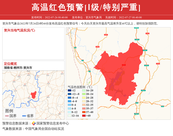 资兴市气象台2022年7月26日8时40分发布高温红色预警信号:今天白天资兴市最高气温将升至40℃以上,请特别加强防范。 信息来源:国家预警信息发布中心; 发布单位:资兴市气象局。