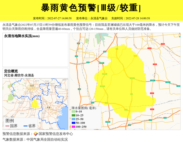 永清县气象台2022年07月27日13时59分继续发布暴雨黄色预警信号:目前我县里澜城镇已出现大于100毫米的降水,预计今天下午至明天白天降雨仍将持续,全县降雨量普遍40-60mm,个别点可达120-150mm,请有关单位和人员做好防范准备。 信息来源:国家预警信息发布中心; 发布单位:永清县气象台。