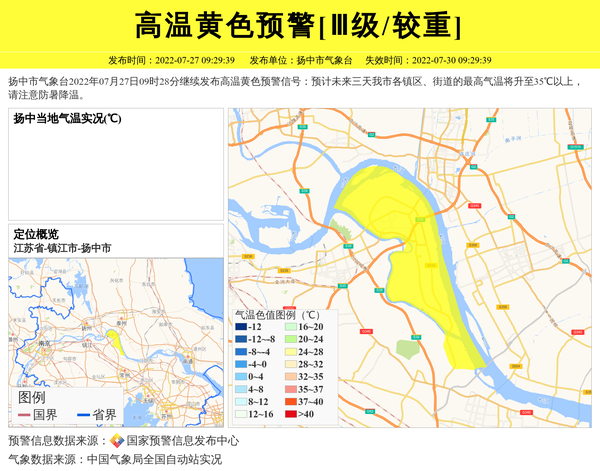 扬中市气象台2022年07月27日09时28分继续发布高温黄色预警信号:预计未来三天我市各镇区、街道的最高气温将升至35℃以上,请注意防暑降温。 信息来源:国家预警信息发布中心; 发布单位:扬中市气象台。