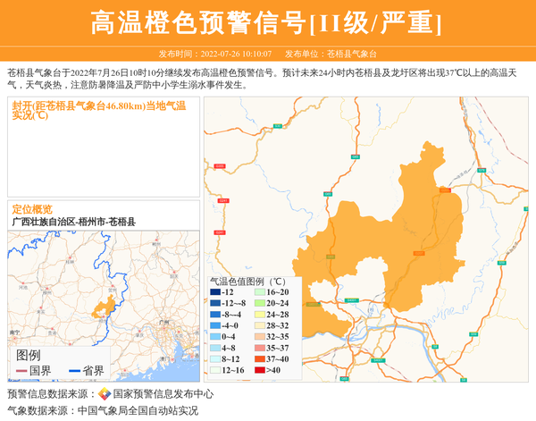 苍梧县气象台于2022年7月26日10时10分继续发布高温橙色预警信号。预计未来24小时内苍梧县及龙圩区将出现37℃以上的高温天气,天气炎热,注意防暑降温及严防中小学生溺水事件发生。 信息来源:国家预警信息发布中心; 发布单位:苍梧县气象台。