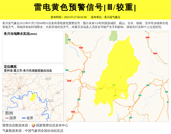 务川县气象台2022年07月27日06时03分发布雷电黄色预警信号:预计未来3小时内我县城区、砚山、分水、镇南、涪洋等乡镇将出现雷电天气,局地伴有短时强降水、大风等强对流天气,对露天活动及人员安全可能产生不利影响,请相关行业和个人注意防范。 信息来源:国家预警信息发布中心; 发布单位:务川县气象台。