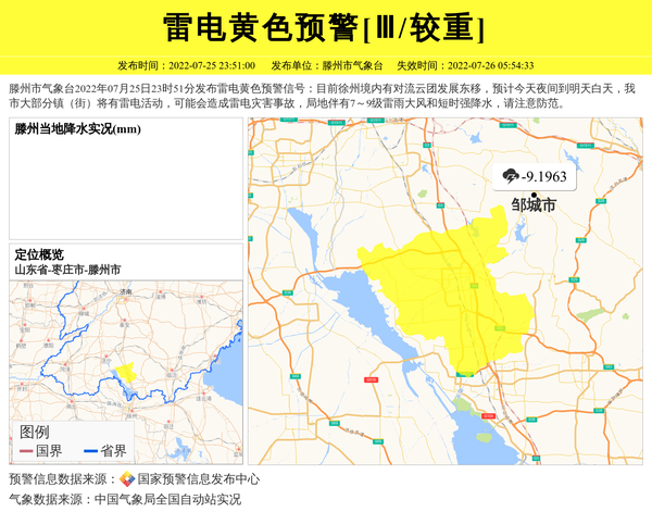 滕州市气象台2022年07月25日23时51分发布雷电黄色预警信号:目前徐州境内有对流云团发展东移,预计今天夜间到明天白天,我市大部分镇(街)将有雷电活动,可能会造成雷电灾害事故,局地伴有7~9级雷雨大风和短时强降水,请注意防范。 信息来源:国家预警信息发布中心; 发布单位:滕州市气象台。