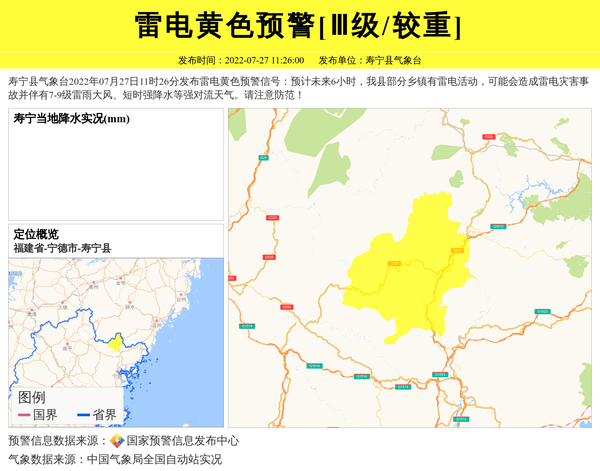 寿宁县气象台2022年07月27日11时26分发布雷电黄色预警信号:预计未来6小时,我县部分乡镇有雷电活动,可能会造成雷电灾害事故并伴有7-9级雷雨大风、短时强降水等强对流天气。请注意防范! 信息来源:国家预警信息发布中心; 发布单位:寿宁县气象台。