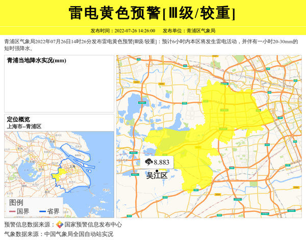 青浦区气象局2022年07月26日14时26分发布雷电黄色预警[Ⅲ级/较重]:预计6小时内本区将发生雷电活动,并伴有一小时20-30mm的短时强降水。 信息来源:国家预警信息发布中心; 发布单位:青浦区气象局。