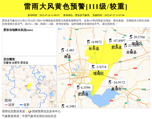 肥东县气象台2022年07月26日11时07分继续发布雷雨大风黄色预警信号。未来6小时内我县马湖乡、桥头集镇、石塘镇等大部分乡镇仍有雷雨大风天气,风力4~5级,阵风7~8级,并伴有雷电、短时强降水等强对流天气。请注意防范! 信息来源:国家预警信息发布中心; 发布单位:肥东县气象局。