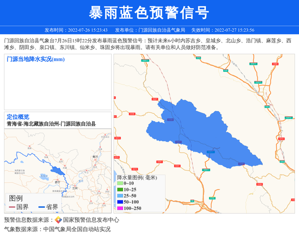 门源回族自治县气象台7月26日15时22分发布暴雨蓝色预警信号:预计未来6小时内苏吉乡、皇城乡、北山乡、浩门镇、麻莲乡、西滩乡、阴田乡、泉口镇、东川镇、仙米乡、珠固乡将出现暴雨。请有关单位和人员做好防范准备。 信息来源:国家预警信息发布中心; 发布单位:门源回族自治县气象局。