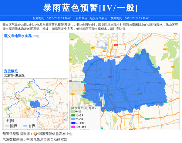 顺义区气象台26日23时30分发布暴雨蓝色预警,预计,27日00时至03时,顺义区将出现小时雨强30毫米以上的短时强降水,浅山区可能出现强降水诱发的泥石流、滑坡、崩塌等次生灾害,低洼地区可能出现积水,请注意防范。 信息来源:国家预警信息发布中心; 发布单位:顺义区气象台。