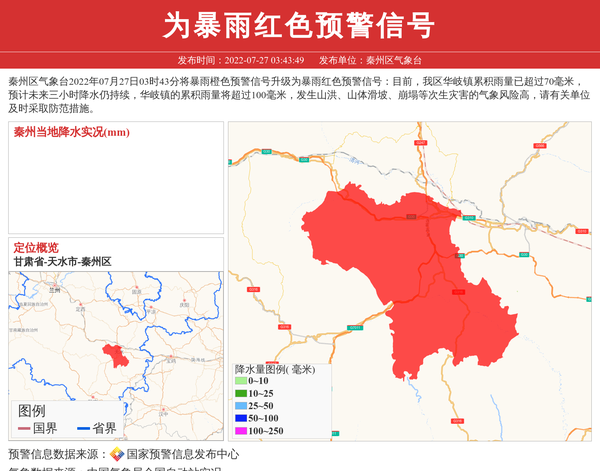 秦州区气象台2022年07月27日03时43分将暴雨橙色预警信号升级为暴雨红色预警信号:目前,我区华岐镇累积雨量已超过70毫米,预计未来三小时降水仍持续,华岐镇的累积雨量将超过100毫米,发生山洪、山体滑坡、崩塌等次生灾害的气象风险高,请有关单位及时采取防范措施。 信息来源:国家预警信息发布中心; 发布单位:秦州区气象台。
