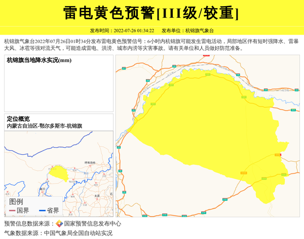 杭锦旗气象台2022年07月26日01时34分发布雷电黄色预警信号:6小时内杭锦旗可能发生雷电活动,局部地区伴有短时强降水、雷暴大风、冰雹等强对流天气,可能造成雷电、洪涝、城市内涝等灾害事故。请有关单位和人员做好防范准备。 信息来源:国家预警信息发布中心; 发布单位:杭锦旗气象台。