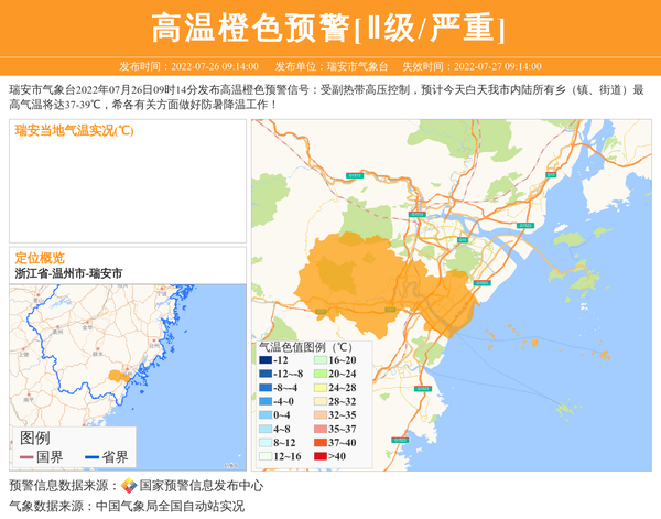 瑞安市气象台2022年07月26日09时14分发布高温橙色预警信号:受副热带高压控制,预计今天白天我市内陆所有乡(镇、街道)最高气温将达37-39℃,希各有关方面做好防暑降温工作! 信息来源:国家预警信息发布中心; 发布单位:瑞安市气象台。