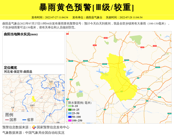 曲阳县气象台2022年07月27日11时04分发布暴雨黄色预警信号:预计今天白天到夜间,我县全部乡镇将有大暴雨(100-130毫米),个别乡镇雨量可达150毫米,请有关单位和人员做好防范。 信息来源:国家预警信息发布中心; 发布单位:曲阳县气象台。