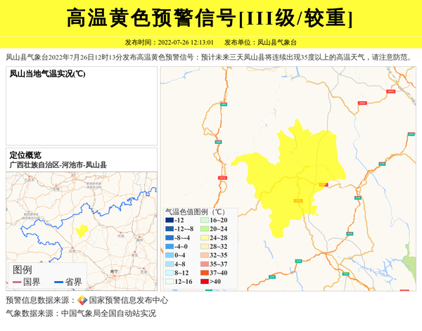 凤山县气象台2022年7月26日12时13分发布高温黄色预警信号:预计未来三天凤山县将连续出现35度以上的高温天气,请注意防范。 信息来源:国家预警信息发布中心; 发布单位:凤山县气象台。