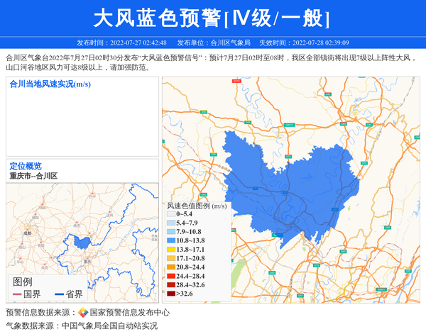 合川区气象台2022年7月27日02时30分发布“大风蓝色预警信号”:预计7月27日02时至08时,我区全部镇街将出现7级以上阵性大风,山口河谷地区风力可达8级以上,请加强防范。 信息来源:国家预警信息发布中心; 发布单位:合川区气象局。