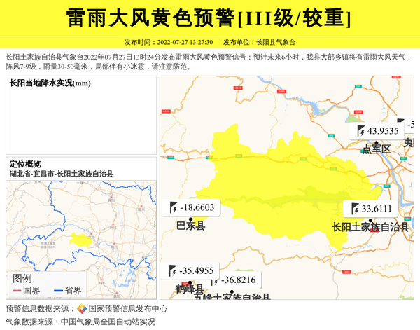 长阳土家族自治县气象台2022年07月27日13时24分发布雷雨大风黄色预警信号:预计未来6小时,我县大部乡镇将有雷雨大风天气,阵风7-9级,雨量30-50毫米,局部伴有小冰雹,请注意防范。 信息来源:国家预警信息发布中心; 发布单位:长阳县气象台。