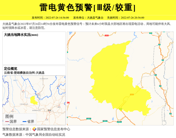 大姚县气象台2022年07月26日14时56分发布雷电黄色预警信号:预计未来6小时我县大部地区将出现雷电活动,局地可能伴有大风、短时强降水或冰雹,请注意防范。 信息来源:国家预警信息发布中心; 发布单位:大姚县气象台。