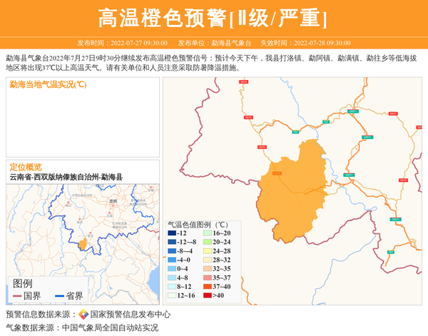 勐海县气象台2022年7月27日9时30分继续发布高温橙色预警信号:预计今天下午,我县打洛镇、勐阿镇、勐满镇、勐往乡等低海拔地区将出现37℃以上高温天气。请有关单位和人员注意采取防暑降温措施。 信息来源:国家预警信息发布中心; 发布单位:勐海县气象台。