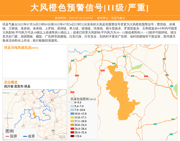 珙县气象台2022年07月26日23时05分将2022年07月26日22时32分发布的大风蓝色预警信号变更为大风橙色预警信号:曹营镇、沐滩镇、王家镇、洛亥镇、洛表镇、上罗镇、底洞镇、孝儿镇、巡场镇、珙泉镇、观斗苗族乡、罗渡苗族乡、玉和苗族乡6小时内可能受大风影响,平均风力可达10级以上或者阵风11级以上;或者已经受大风影响,平均风力为10—11级或者阵风11—12级并可能持续。请注意关好门窗,加固围板、棚架、广告牌等搭建物。注意行路、行车安全,刮风时不要在广告牌、临时搭建物等下面逗留,暂停露天集体活动和水上作业,航行船舶回港避风。 信息来源:国家预警信息发布中心; 发布单位:珙县气象台。
