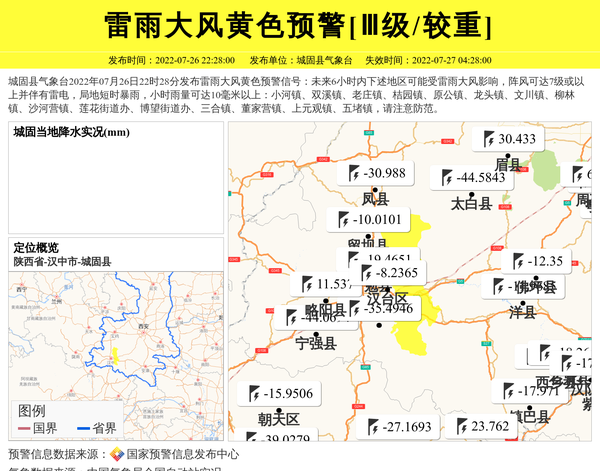 城固县气象台2022年07月26日22时28分发布雷雨大风黄色预警信号:未来6小时内下述地区可能受雷雨大风影响,阵风可达7级或以上并伴有雷电,局地短时暴雨,小时雨量可达10毫米以上:小河镇、双溪镇、老庄镇、桔园镇、原公镇、龙头镇、文川镇、柳林镇、沙河营镇、莲花街道办、博望街道办、三合镇、董家营镇、上元观镇、五堵镇,请注意防范。 信息来源:国家预警信息发布中心; 发布单位:城固县气象台。