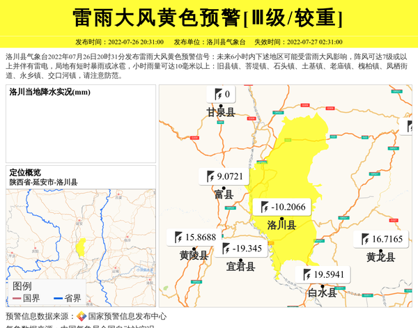 洛川县气象台2022年07月26日20时31分发布雷雨大风黄色预警信号:未来6小时内下述地区可能受雷雨大风影响,阵风可达7级或以上并伴有雷电,局地有短时暴雨或冰雹,小时雨量可达10毫米以上:旧县镇、菩堤镇、石头镇、土基镇、老庙镇、槐柏镇、凤栖街道、永乡镇、交口河镇,请注意防范。 信息来源:国家预警信息发布中心; 发布单位:洛川县气象台。